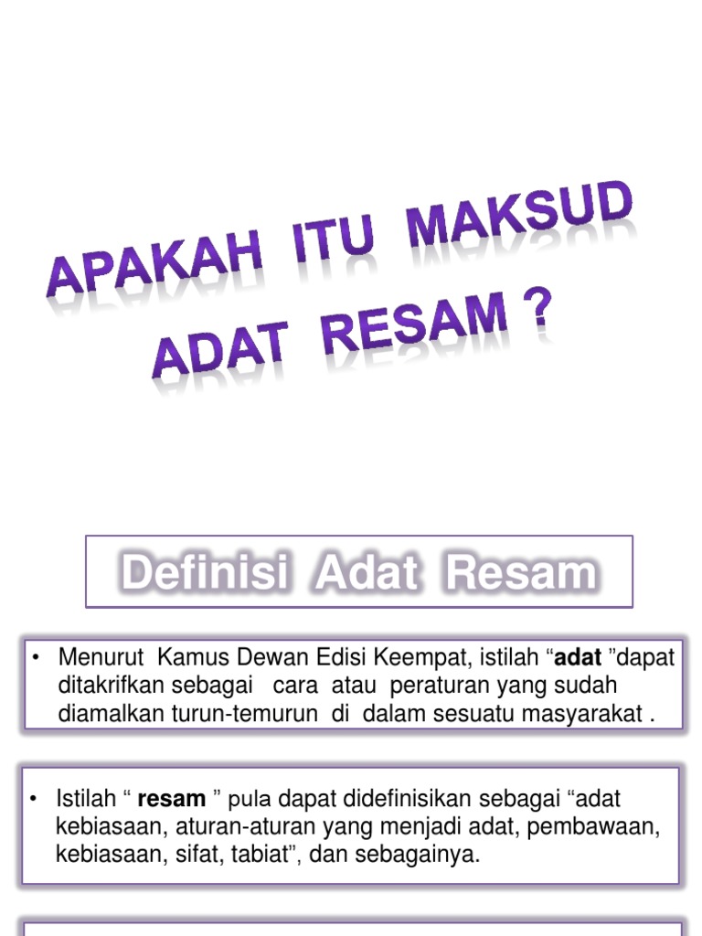 عادة ʿādah ialah kebiasaan resam lembaga peraturan hukum norma yang dijunjung oleh kelompok masyarakatDalam bahasa Melayu lama adat merujuk kepada undang-undang atau hukum adat yang merangkumi bidang sosial politik ekonomi bahkan undang-undang samudera. - Hormat ibu bapa - Hormat kerajaan dan negara - Patuh kepada undang-undang - Hormat ahli keluarga guru rakan jiran - Hormat kepercayaan dan adat resam pelbagai bangsa - Patuh kepada ketetapan masa 5. Jalan Tasik Off Jalan Maktab Gaya 88300 Luyang Kota Kinabalu.